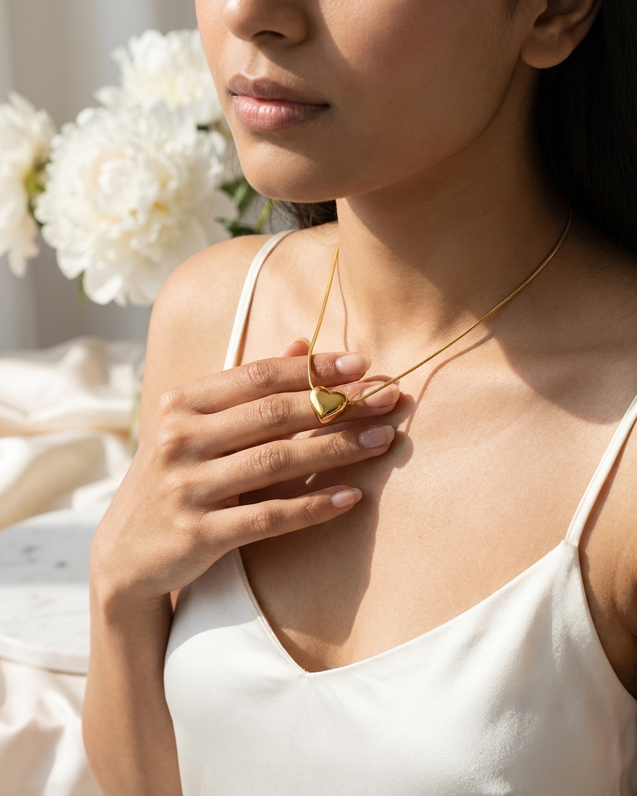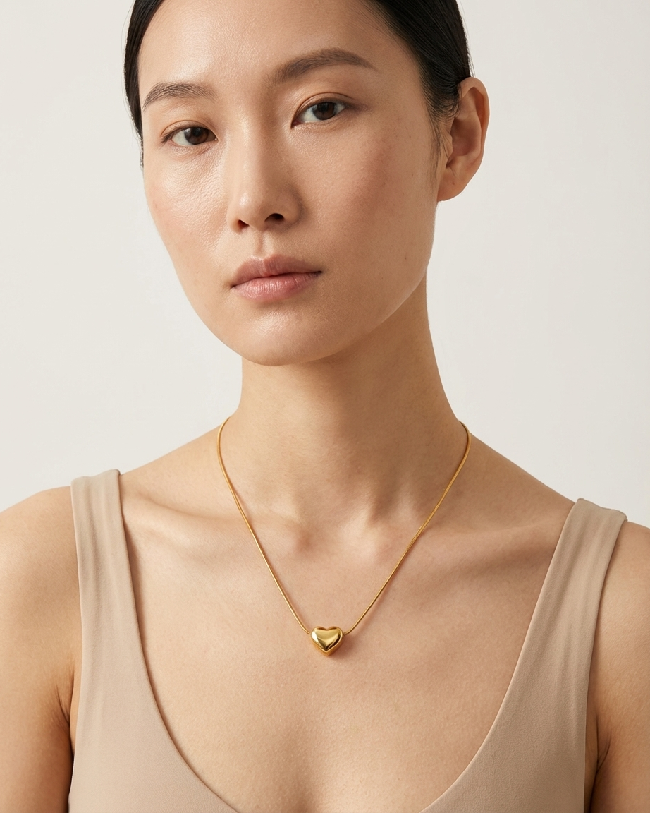 Our 3D Puffy Heart Necklace is designed for those who love bold simplicity. Moving away from flat charms, this pendant offers a beautiful, rounded dimension that catches the light from every angle. Suspended from a smooth, liquid-like snake chain, this piece defines the “Clean Girl” aesthetic and adds a touch of high-end polish to any outfit.