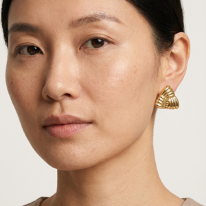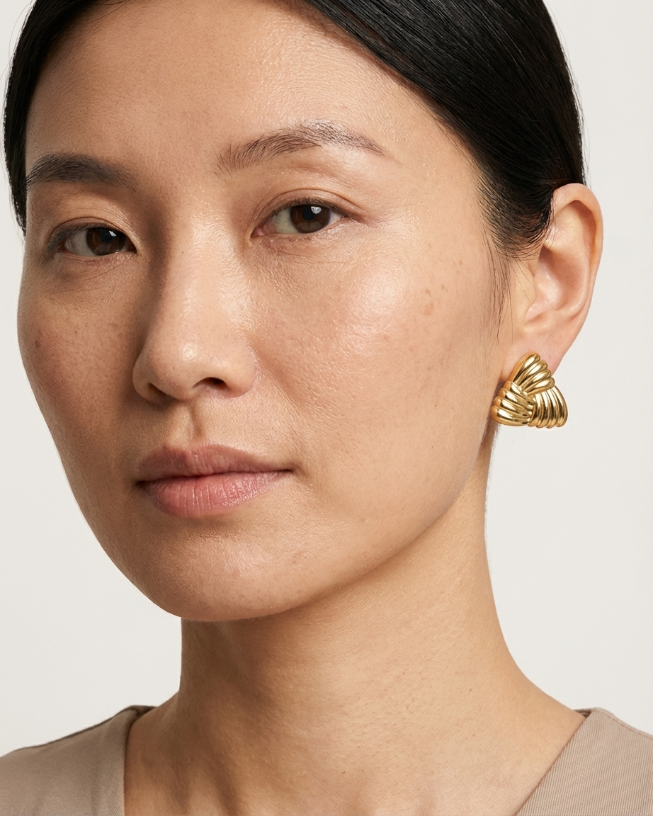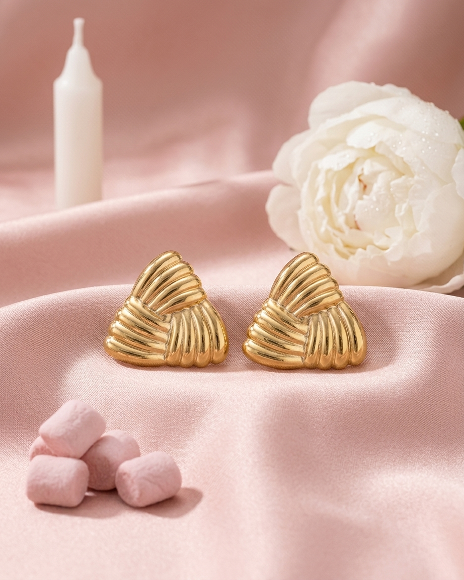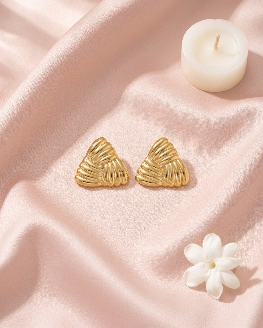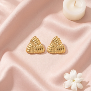 Elevate your everyday luxury with our Abstract Ribbed Triangle Studs. Moving away from standard geometric shapes, these earrings feature an intricate, multi-directional ribbed texture that creates a dynamic play of light and shadow. The bold, voluminous 3D design provides a modern, “sculptural” look that is perfect for those who want a statement piece that still feels minimalist and refined.