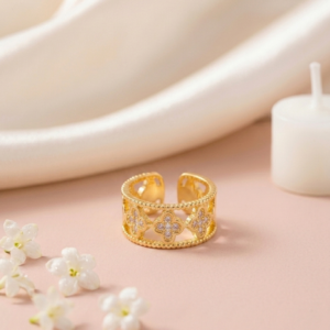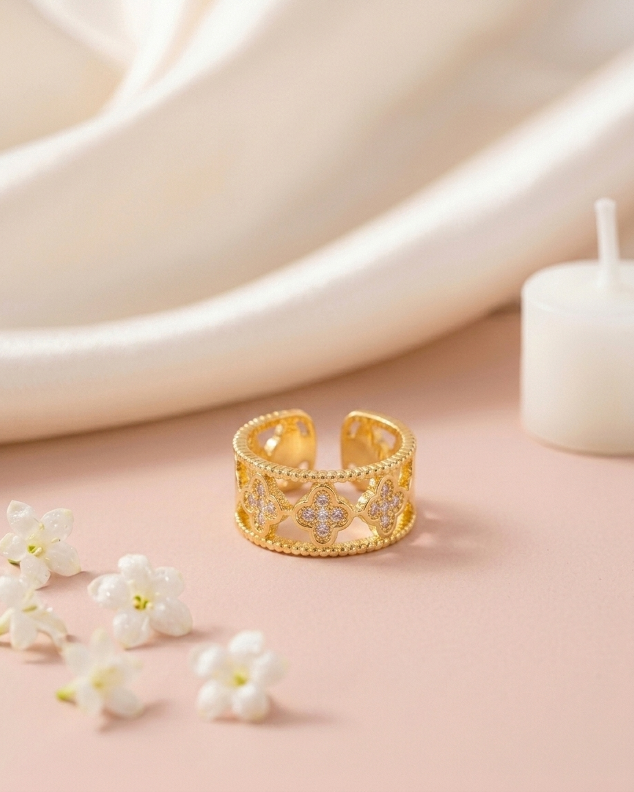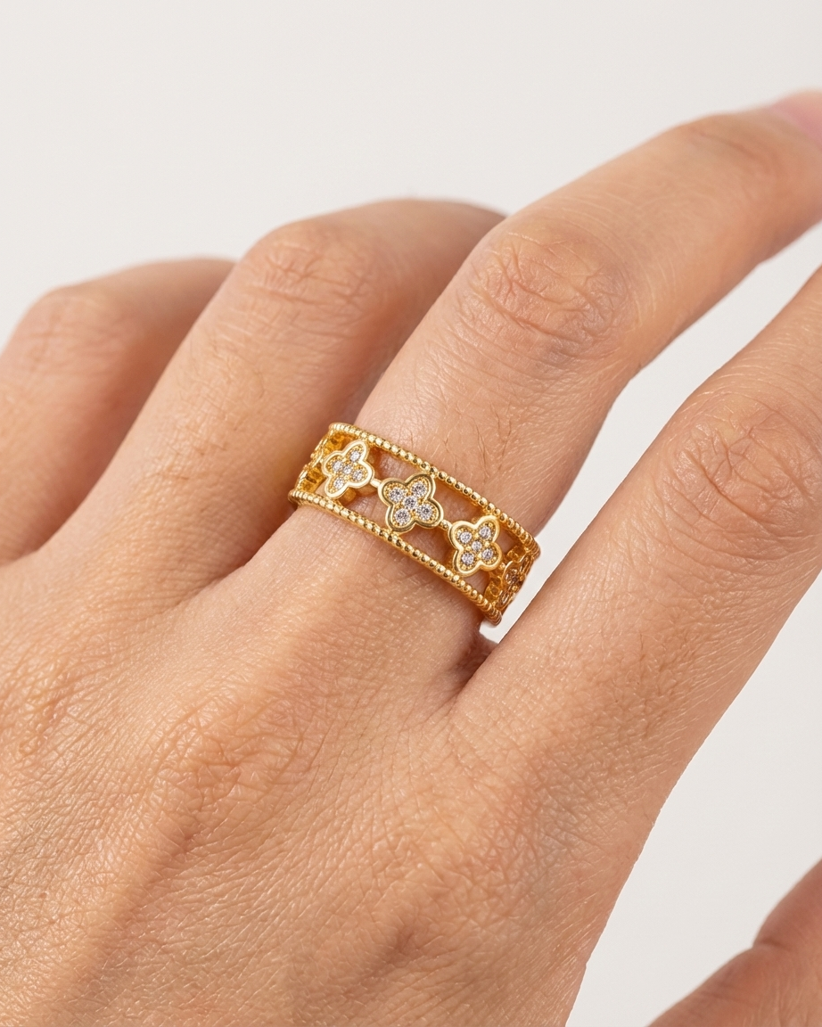 Intricate elegance for the modern woman. This 18K gold-plated ring features a unique filigree design with crystal-encrusted clovers and a beaded edge, crafted from 100% waterproof and anti-tarnish materials for a lifetime of shine.