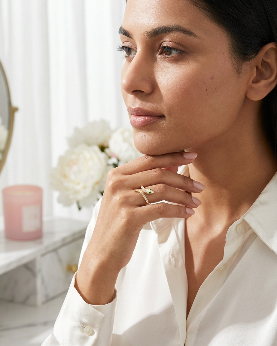 Our Crystal Snake Wrap Ring is designed for the bold and the stylish. This modern bypass ring features a meticulously detailed serpent that elegantly coils around your finger. Crafted with high-shine 18K gold plating and shimmering AAA+ grade crystals, it strikes the perfect balance between high-fashion “street style” and timeless elegance.