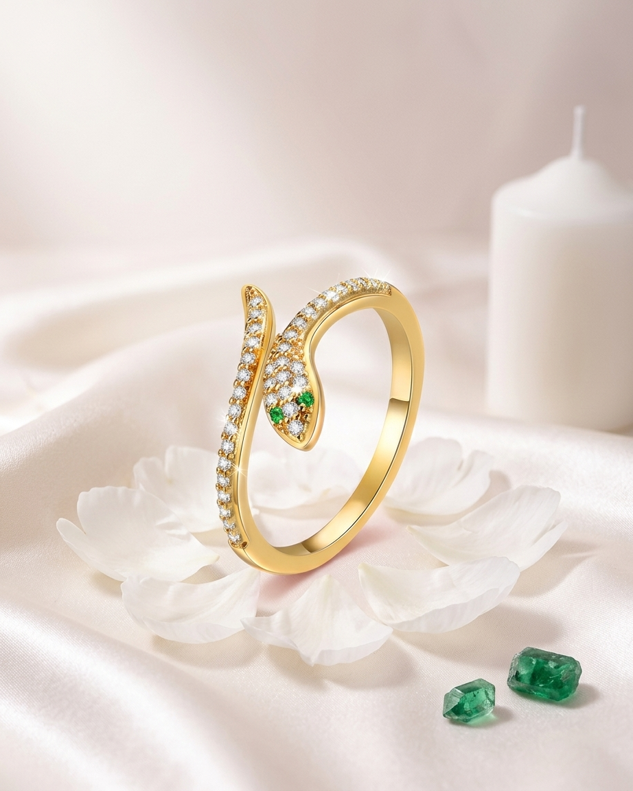 Channel your inner power with this 18K gold-plated snake ring. Featuring a sparkling crystal-encrusted body and vibrant green eyes, this adjustable bypass ring offers an edgy yet refined look that is completely waterproof and anti-tarnish.