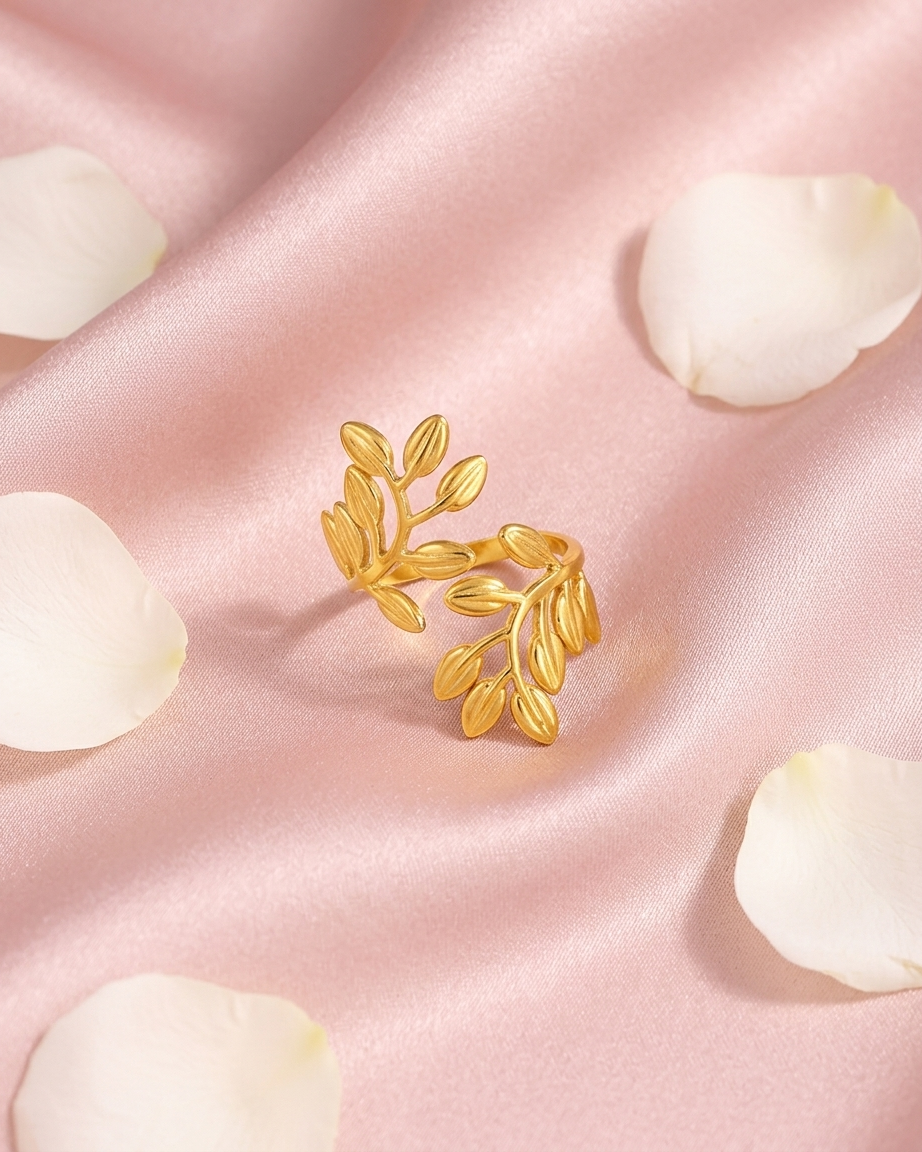 Embrace the symbol of peace and triumph. This 18K gold-plated wrap ring features a detailed olive branch design, meticulously crafted from waterproof and anti-tarnish stainless steel for effortless, everyday luxury.