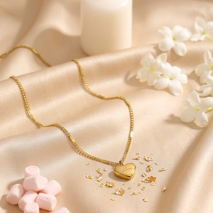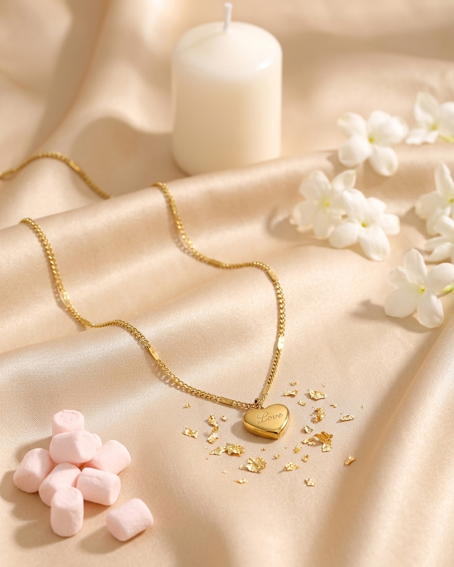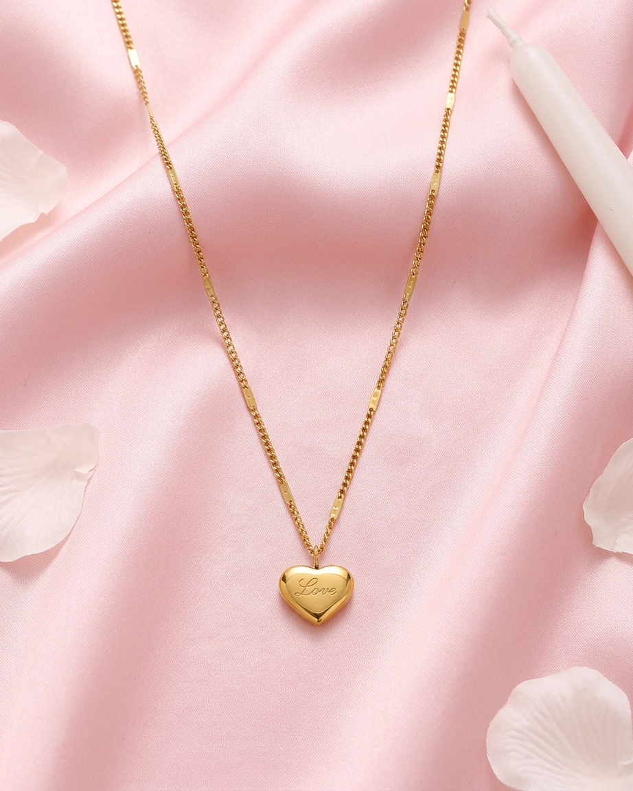 Our Engraved “Love” Puffy Heart Necklace is designed to be a signature staple in your collection. The pendant features a rounded, 3D “poured gold” silhouette that feels substantial yet lightweight. With its fine script engraving, it adds a personal, feminine touch to the “Quiet Luxury” aesthetic. The necklace is further elevated by a specialized chain that alternates between classic links and polished bars, creating a sophisticated play of light.