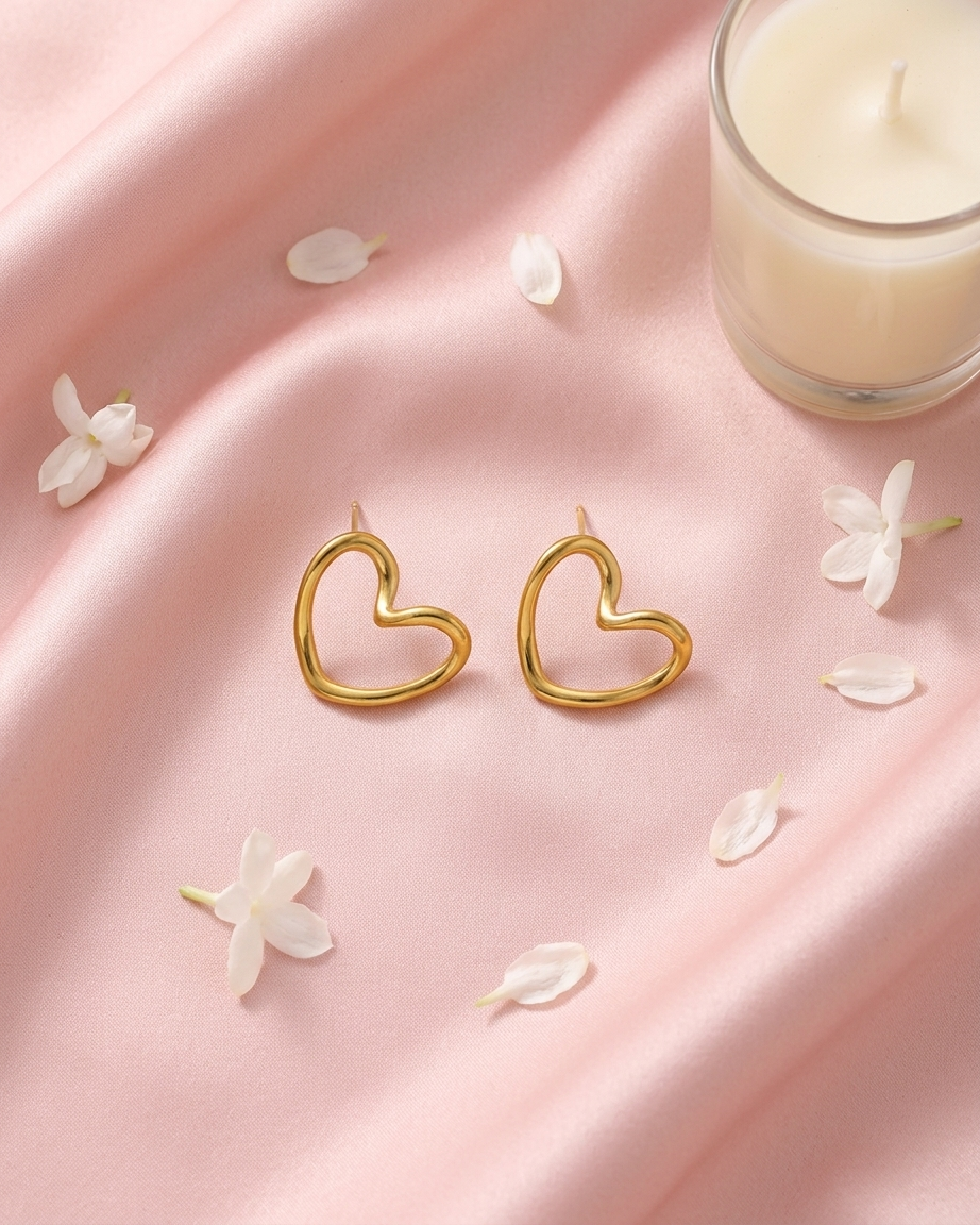 A modern twist on a romantic classic. These 18K gold-plated studs feature a unique, molten-edge heart silhouette and a premium anti-tarnish finish, making them the perfect everyday staple for effortless elegance.