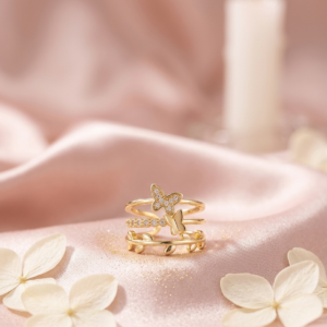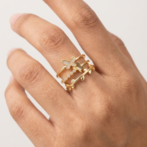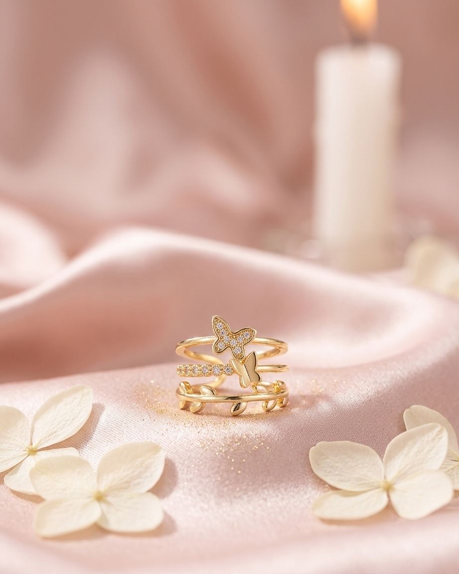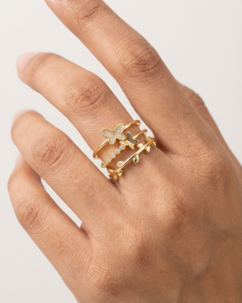 Effortless stacking in a single piece. This 18K gold-plated ring features a triple-layer design with crystal-encrusted butterflies and polished leaves, crafted from 100% waterproof and anti-tarnish materials for lasting daily elegance.