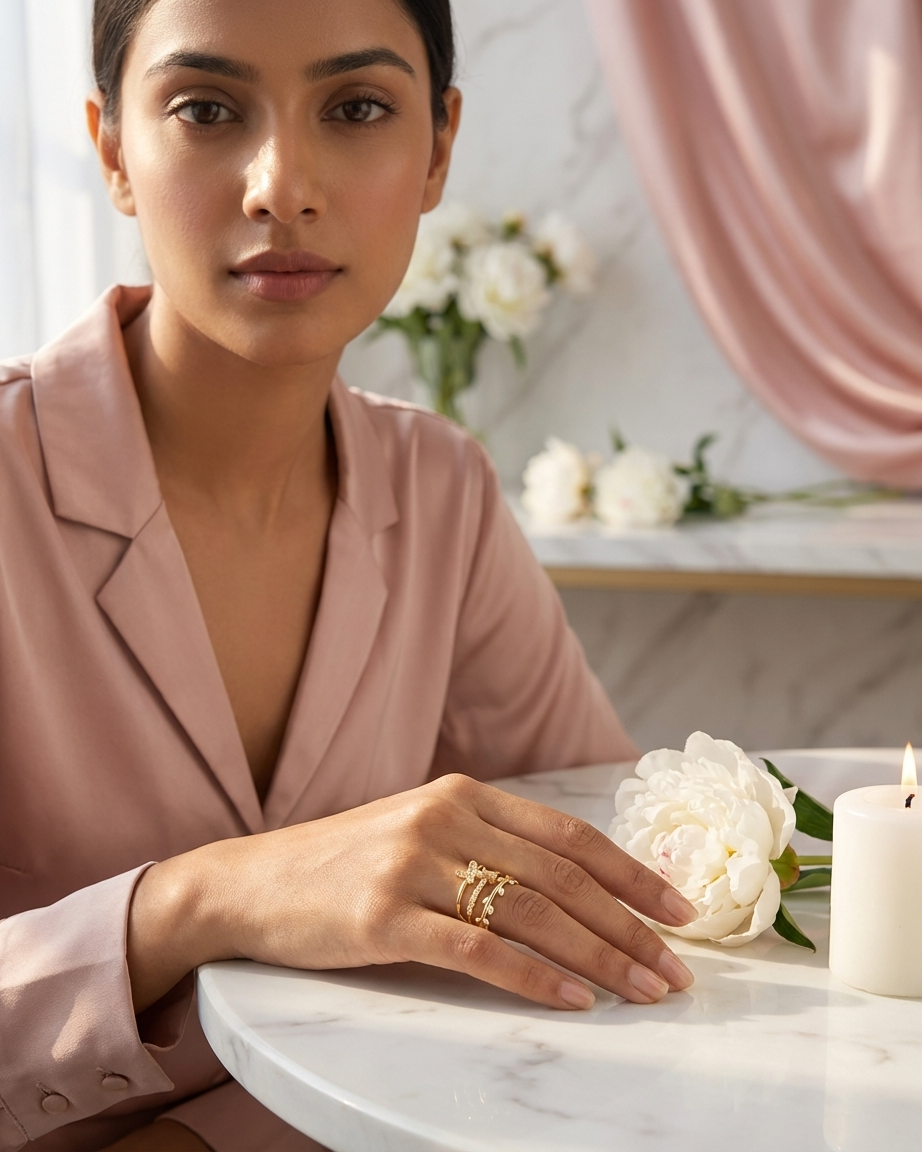 Our Multi-Layer Butterfly & Leaf Statement Ring is designed for those who want the look of a professionally styled ring stack without the effort. The unique triple-band architecture creates a bold, wide-profile appearance that remains lightweight and comfortable. The top band features a delicate butterfly accented with brilliant AAA+ crystals, the middle band is a row of shimmering pavé-set stones, and the bottom band showcases a polished laurel-leaf motif. Together, they create a harmonious, nature-inspired design that radiates luxury.