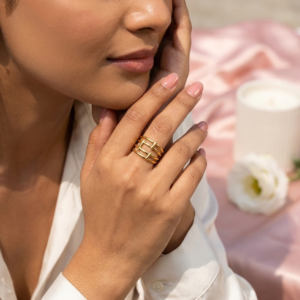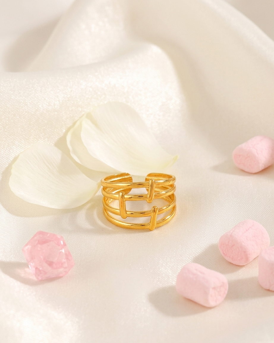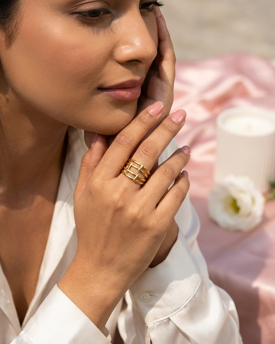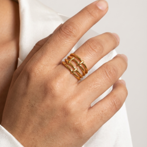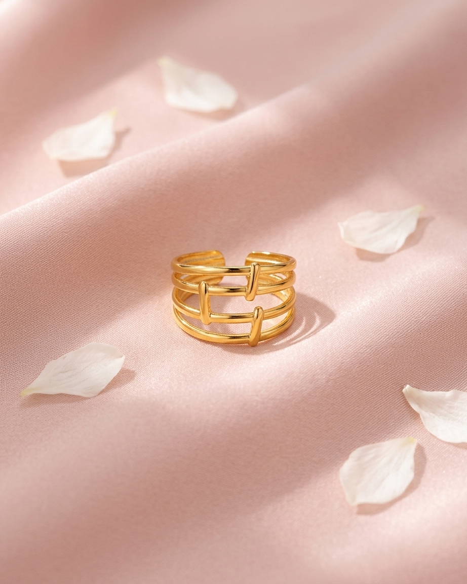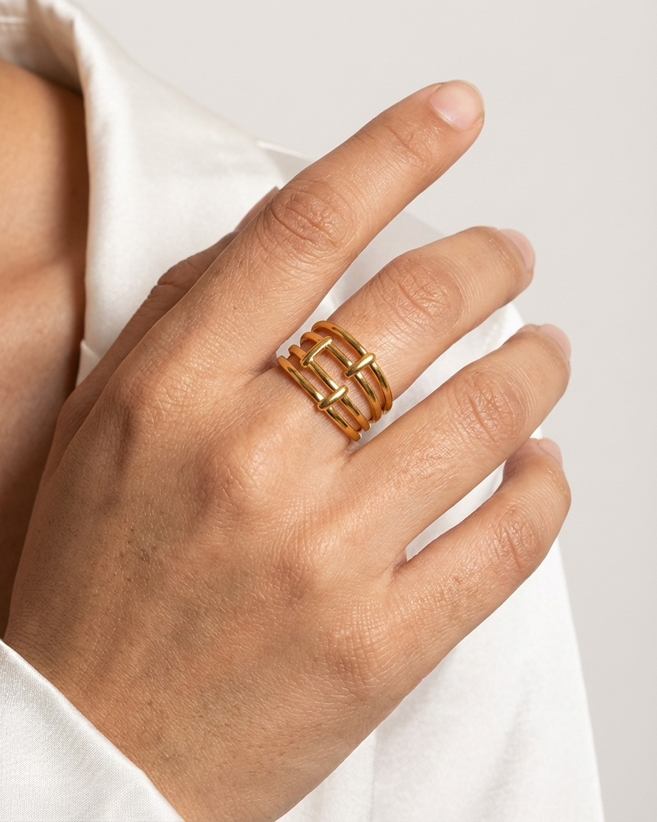 Our Multi-Layered Geometric Ring is designed for those who love the look of a curated ring stack but value the simplicity of a single statement piece. The design features three parallel horizontal bands connected by vertical bars, creating an open, airy silhouette that feels both substantial and modern. Crafted from premium materials and finished with a heavy gold plating, this ring provides a “Quiet Luxury” feel that transitions seamlessly from day to night.