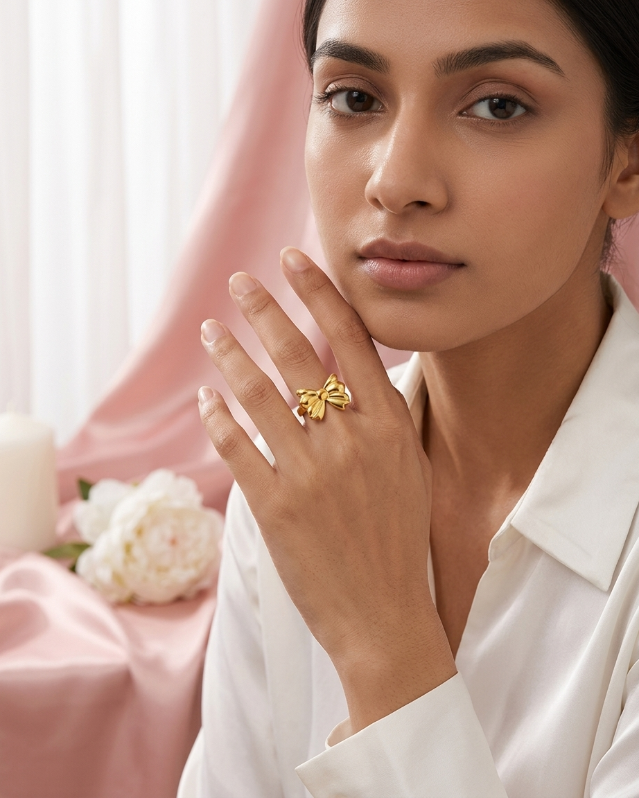 Our High-Polish Bow Statement Ring is designed for the woman who appreciates a blend of classic romance and modern bold design. The centerpiece is a meticulously crafted 3D bow, featuring soft curves and realistic ribbon folds that capture and reflect light from every angle. Its smooth, high-shine finish provides a luxurious feel, while the open-back adjustable band ensures a custom, comfortable fit on any finger. Whether paired with professional wear or a weekend brunch outfit, this ring serves as a standout conversation starter.