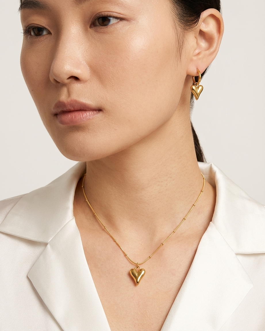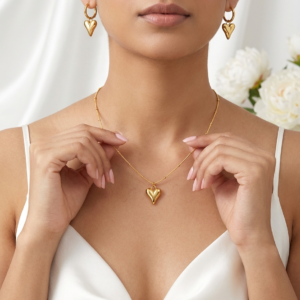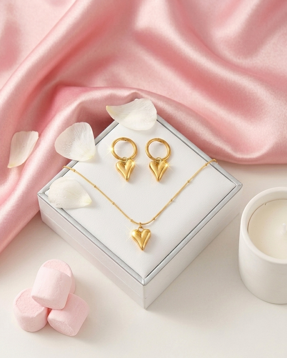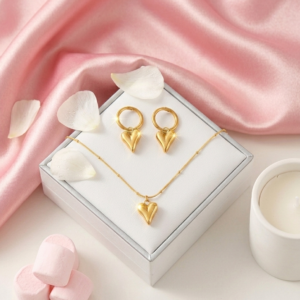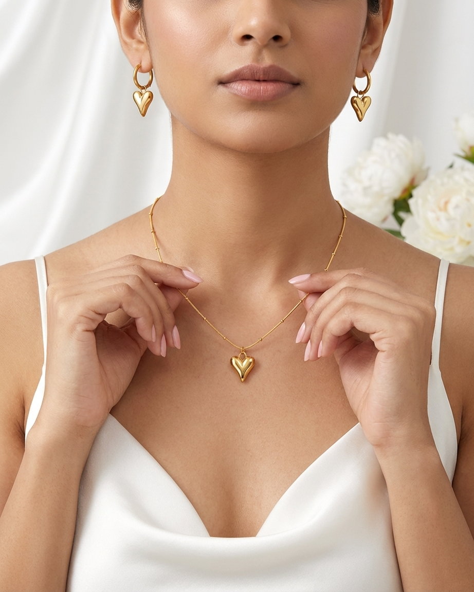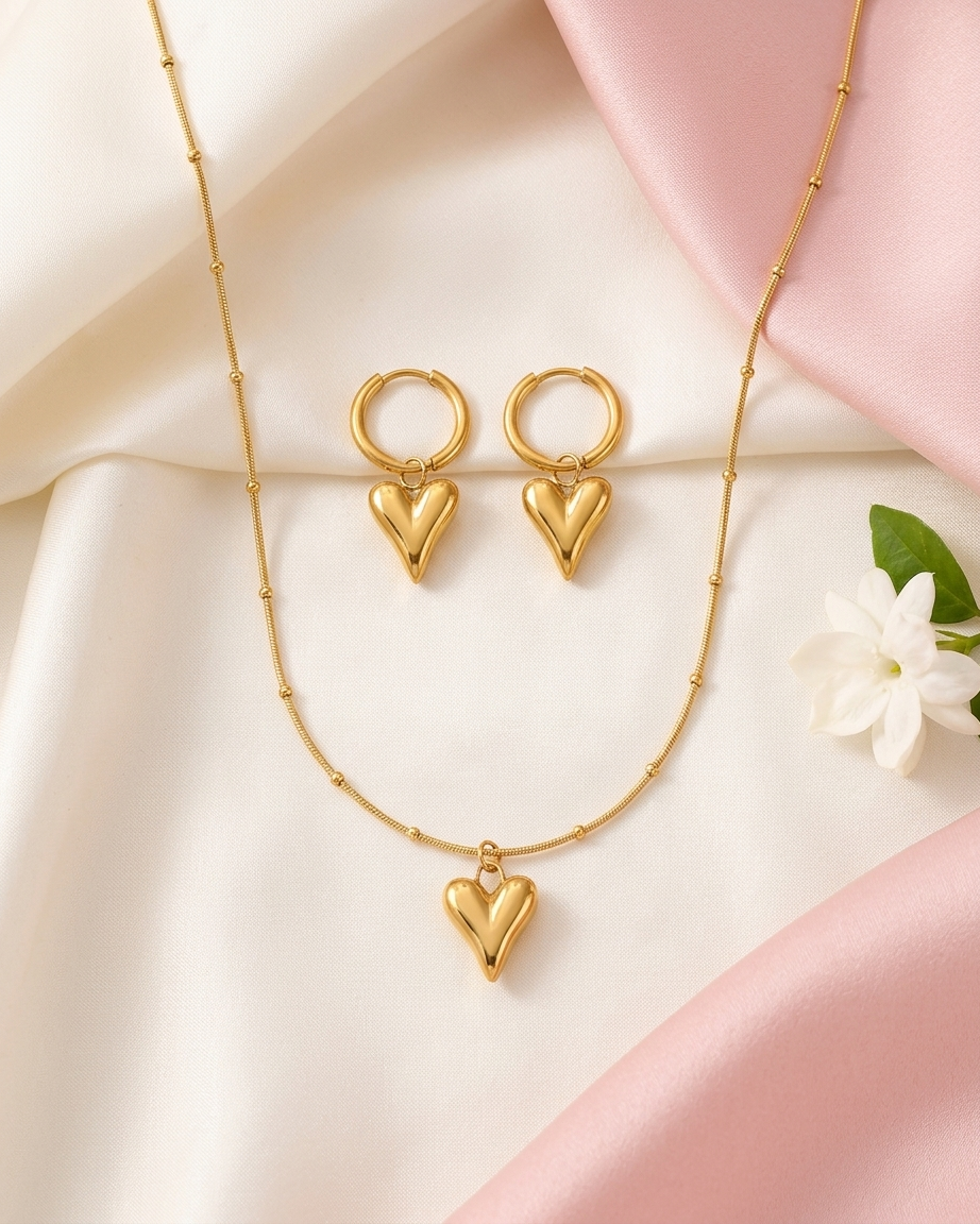 Our Sculpted Heart Jewelry Set is the perfect embodiment of high-value feminine style. The necklace features a unique elongated heart pendant suspended from a sleek snake chain, which is accented with polished gold beads for added texture and shimmer. The matching earrings feature the same elegant heart charms dangling from classic gold hoops, creating a cohesive look that moves beautifully. Engineered for the modern woman, this set is entirely “life-proof”—it won’t tarnish or lose its glow, even with continuous daily wear.
