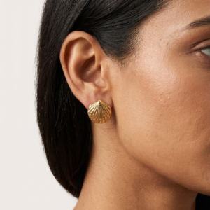 A touch of seaside sophistication. These 18K gold-plated stainless steel studs feature a beautifully detailed ribbed shell design, offering a 100% waterproof and anti-tarnish finish for a radiant, life-proof glow.