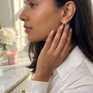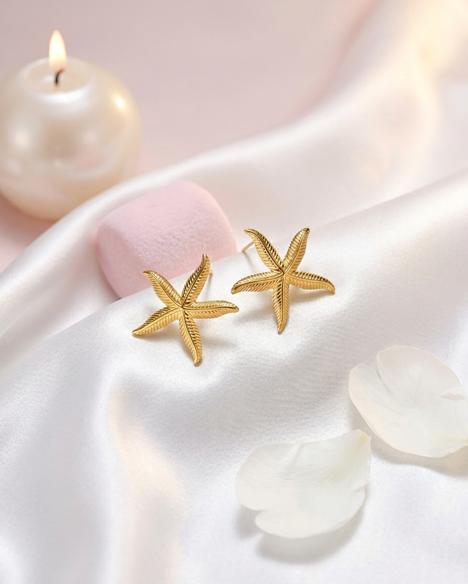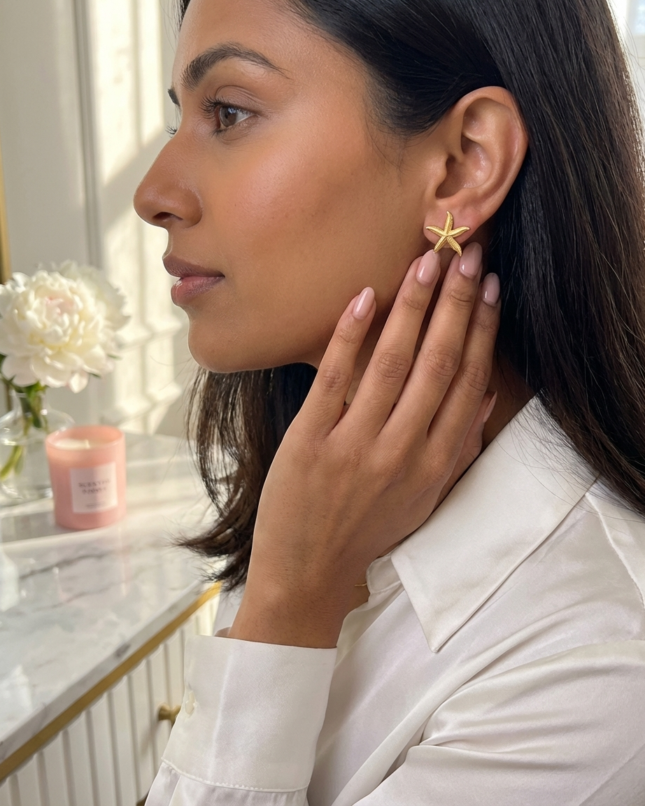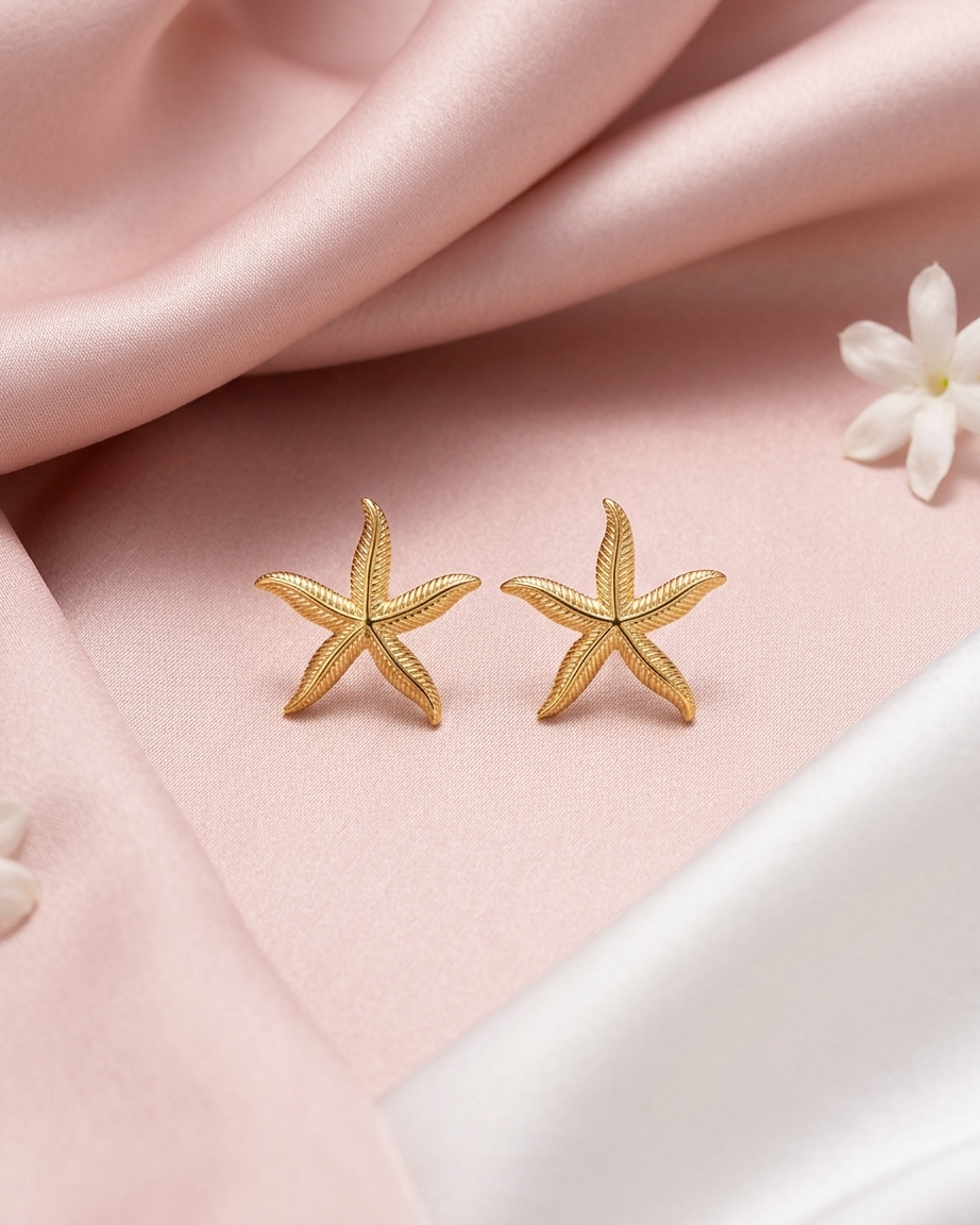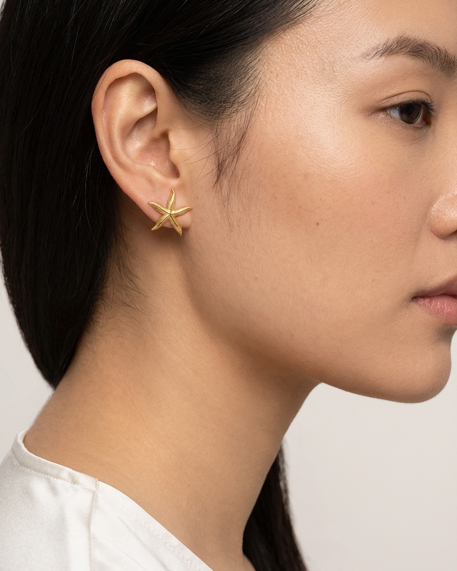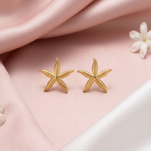 Our Gold Starfish Stud Earrings are designed for those who appreciate artisanal, high-fashion details. Moving away from simple flat shapes, these earrings feature a lifelike, five-point sea star design with a sophisticated ribbed texture that catches the light from every angle. Crafted from premium materials and finished with a durable gold plating, they offer a “Quiet Luxury” feel that transitions seamlessly from beachside escapes to urban professional settings.