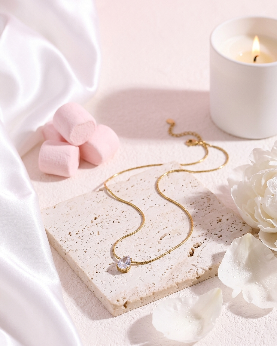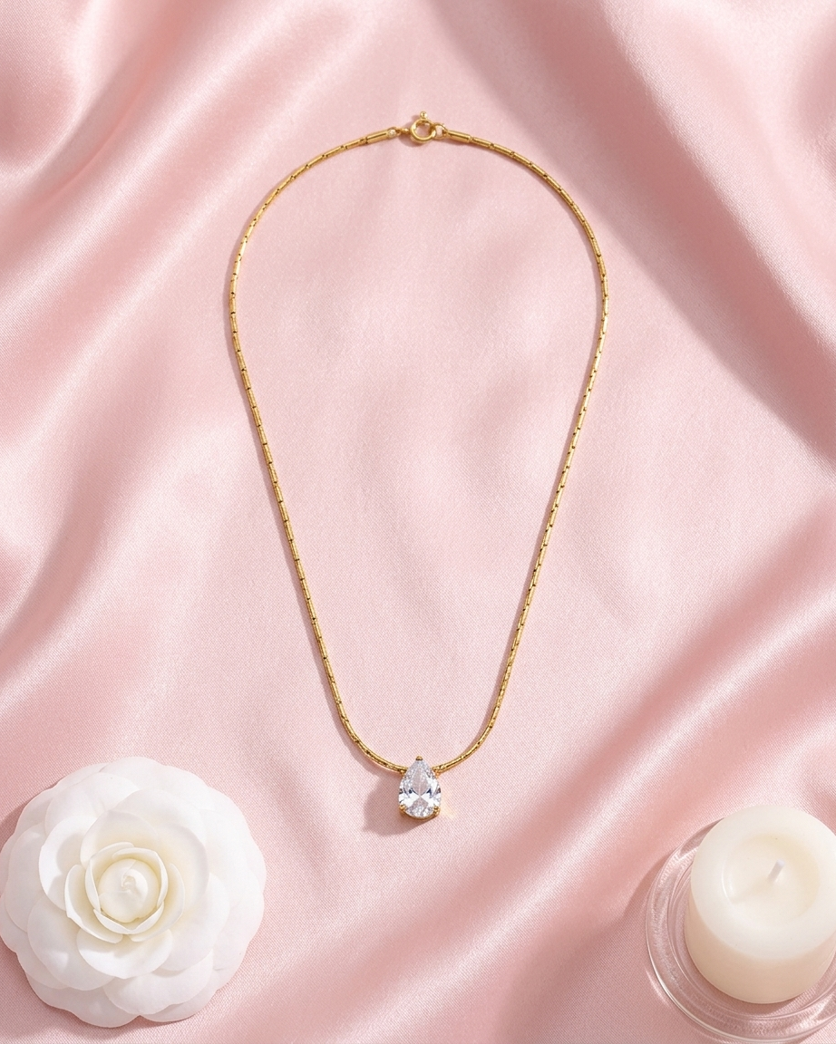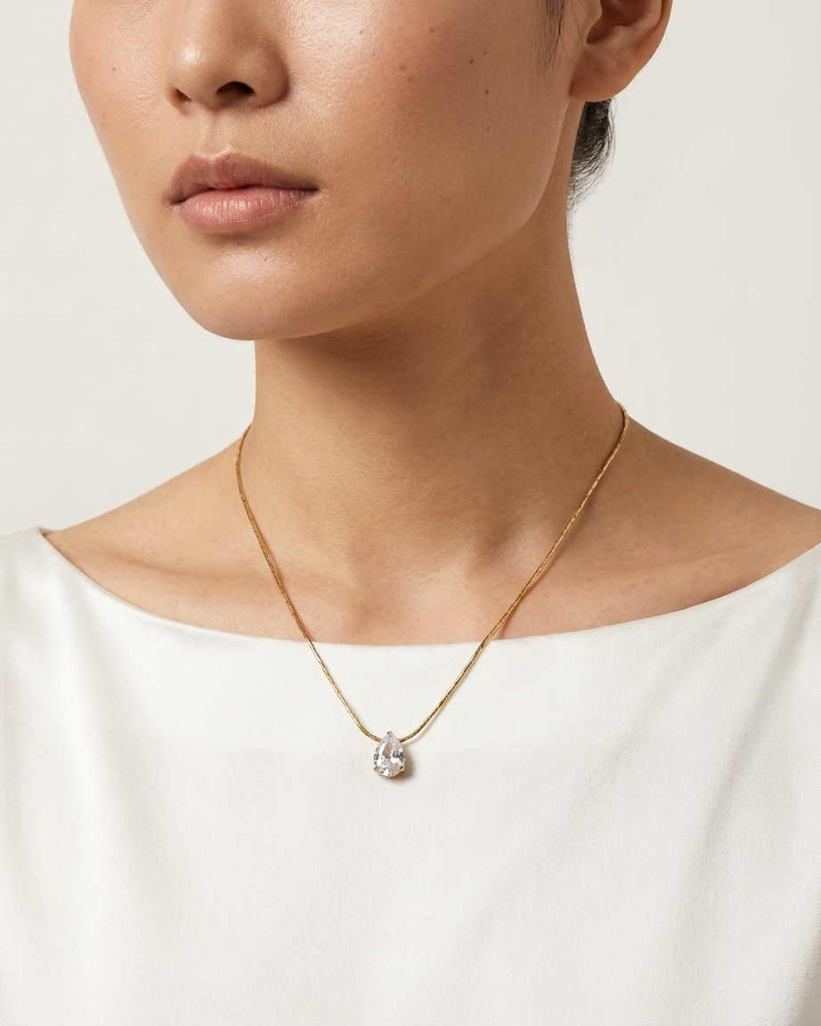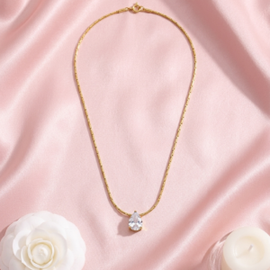 Our Teardrop Crystal Solitaire Necklace is designed for the woman who appreciates a clean, high-authority aesthetic. Moving away from standard link chains, this piece features a specialized “etched” snake chain that provides a seamless, liquid-gold shimmer. The central pear-cut crystal is claw-set to maximize light entry, ensuring a brilliant sparkle that mimics fine diamond jewelry. Crafted for durability, it is the perfect “investment” staple for a curated jewelry wardrobe.