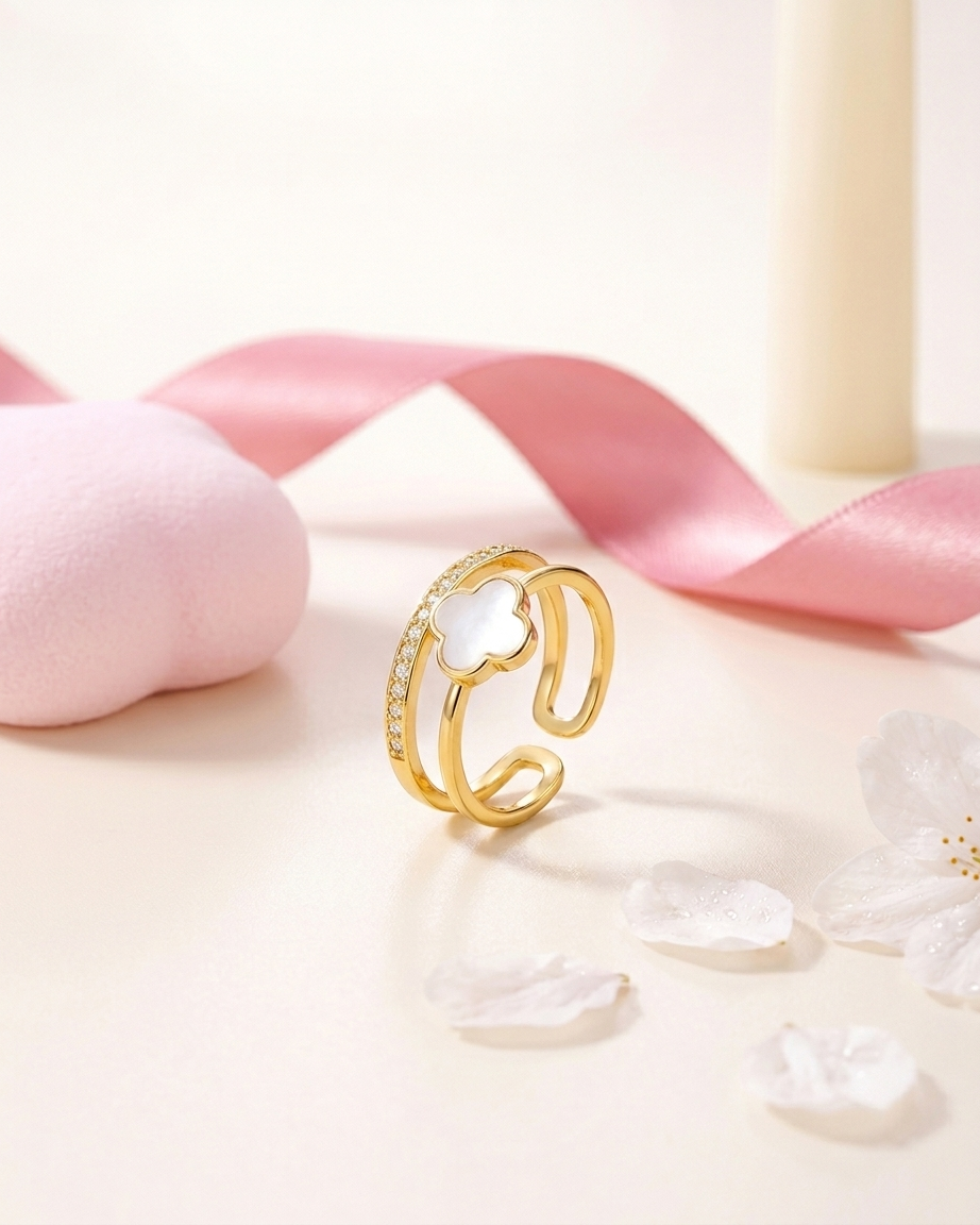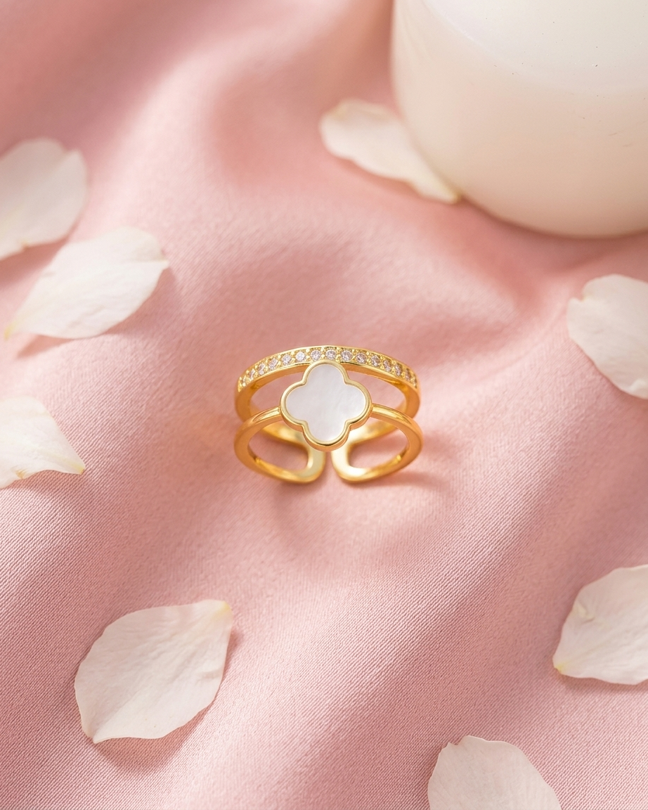Timeless charm meets contemporary brilliance. This 18K gold-plated ring features a dual-band silhouette with a luminous white clover and a pavé crystal accent, crafted from 100% waterproof and anti-tarnish materials for everyday luxury.