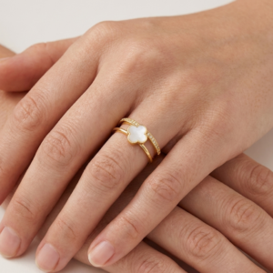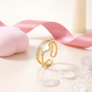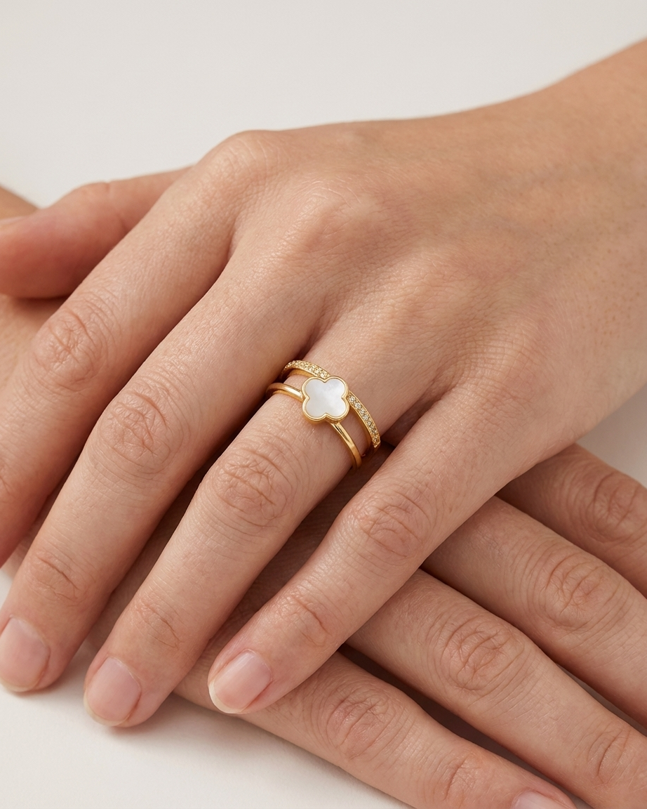 Our White Clover Fusion Dual-Band Ring is the perfect accessory for those who appreciate a clean, “Quiet Luxury” aesthetic. The design features two parallel gold bands connected at the base: one showcasing a delicate white clover pendant and the second meticulously set with shimmering AAA+ cubic zirconia crystals. This tiered structure provides the sophisticated appearance of a curated ring stack while ensuring a comfortable, secure fit throughout the day.