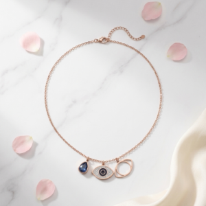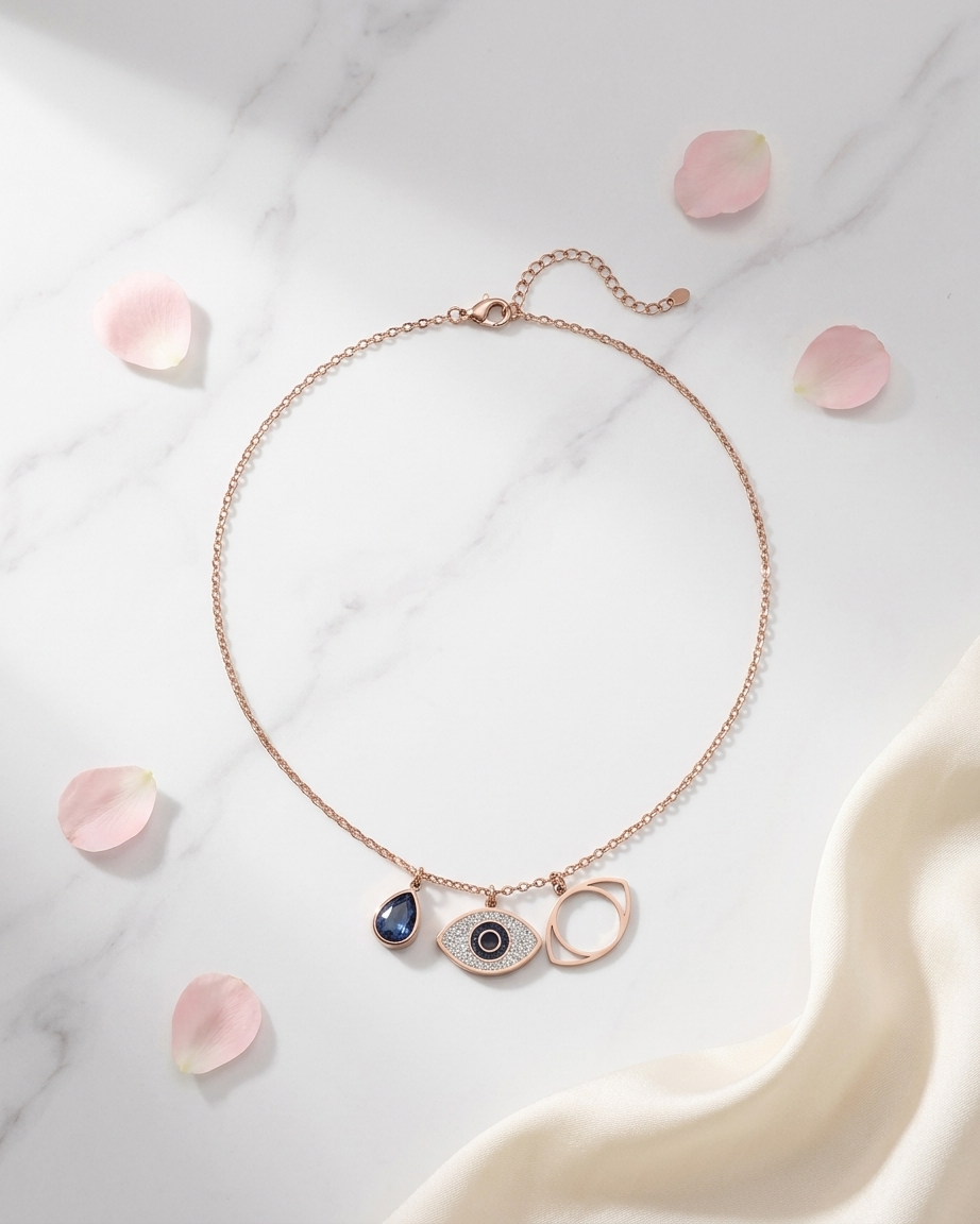 Wear your protection with grace. This rose gold-finished necklace features a tri-charm design with an encrusted evil eye, a deep sapphire blue teardrop, and a minimalist hollow eye, all set on a durable link chain for a meaningful, everyday shimmer.