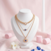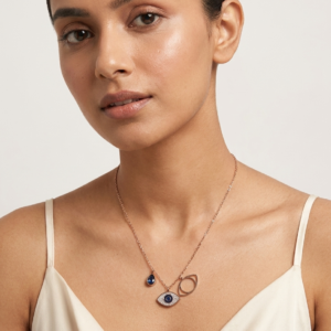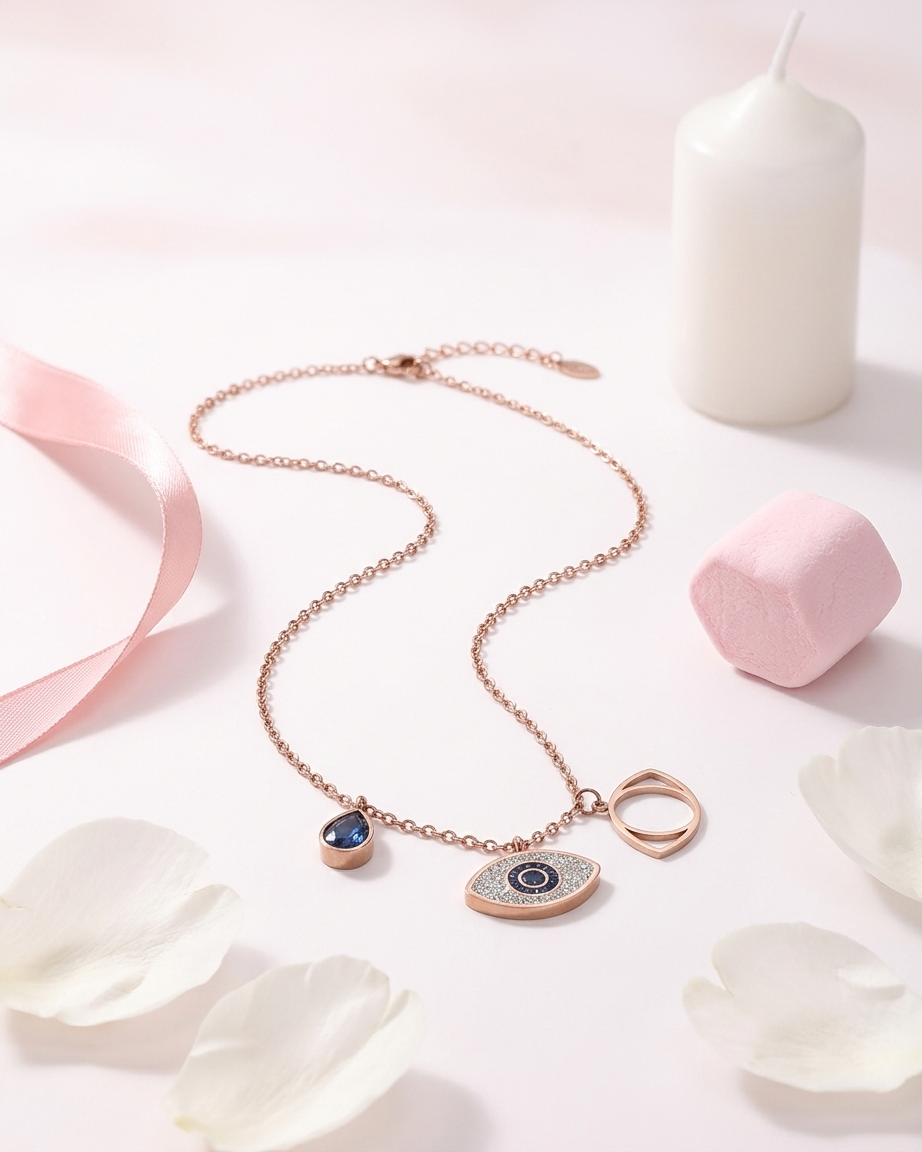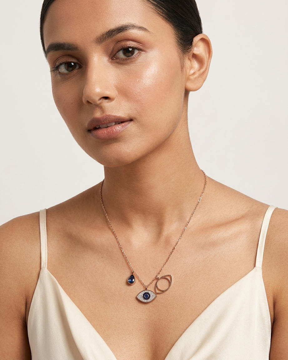 Our Evil Eye Charm Necklace is crafted for the woman who seeks a balance between spiritual intention and aesthetic refinement. The necklace showcases a central evil eye charm, meticulously pavé-set with brilliant clear crystals around a deep blue core. Flanking the center are two additional charms: a rich, faceted sapphire-toned teardrop crystal that catches the light beautifully and a contemporary hollow-eye silhouette in polished rose gold. This multi-layered design offers a modern, curated look that feels both personal and high-end.