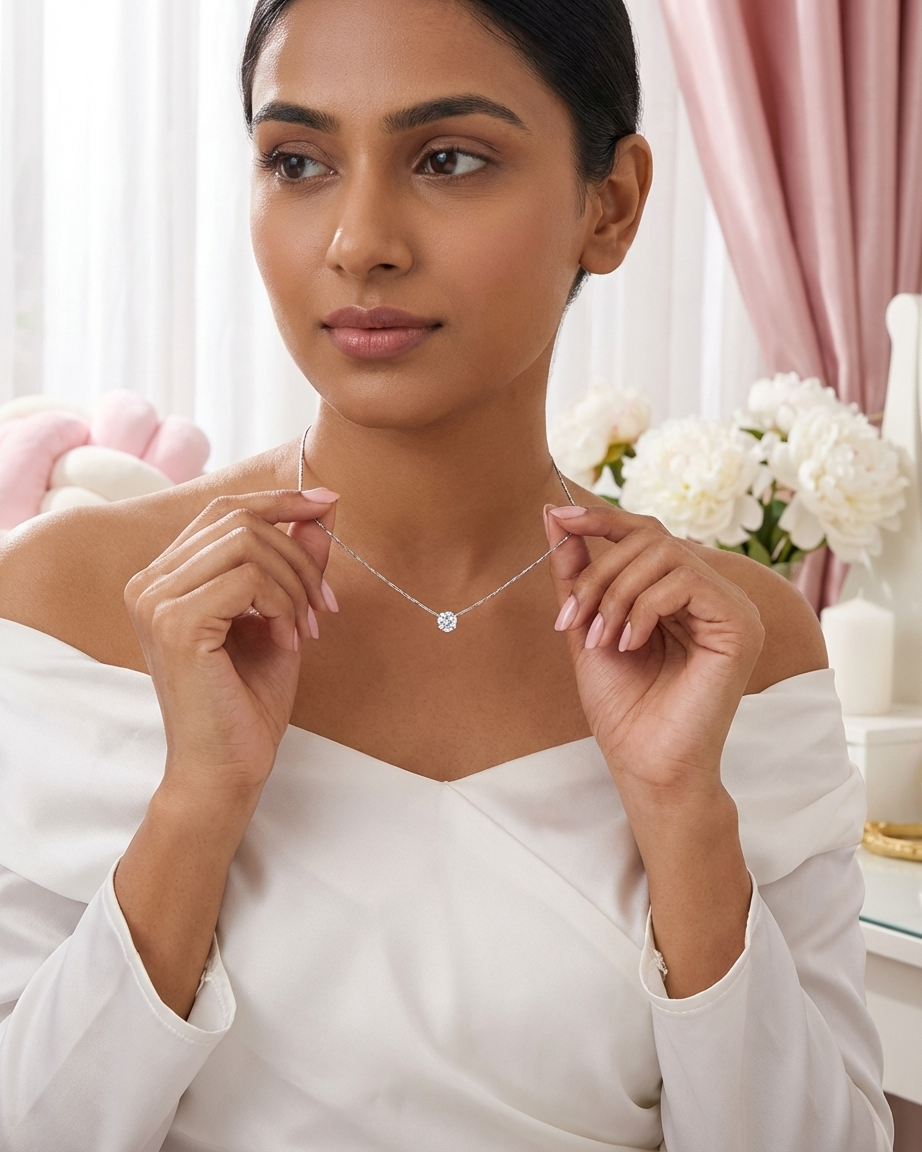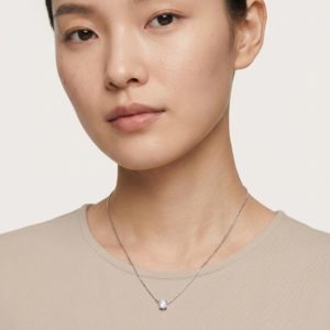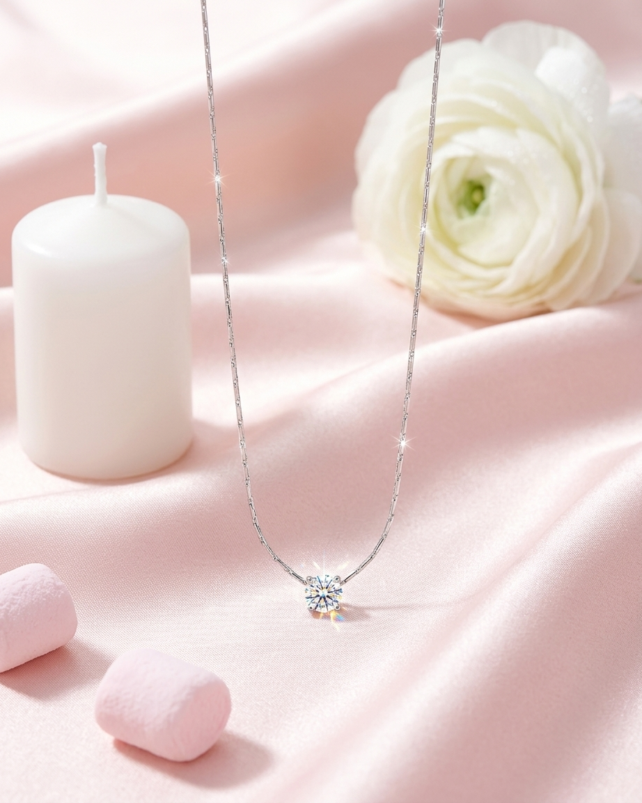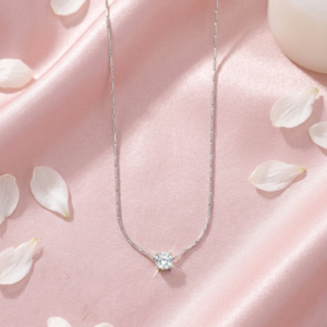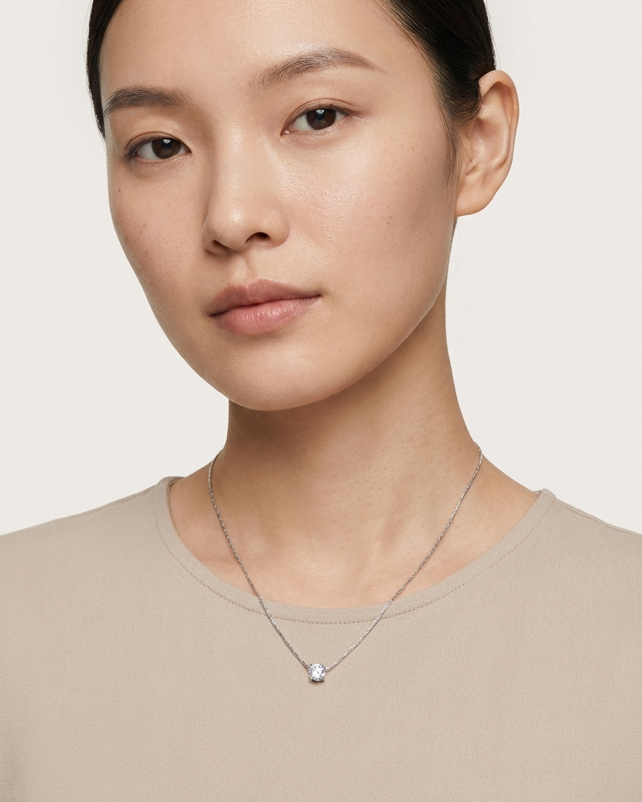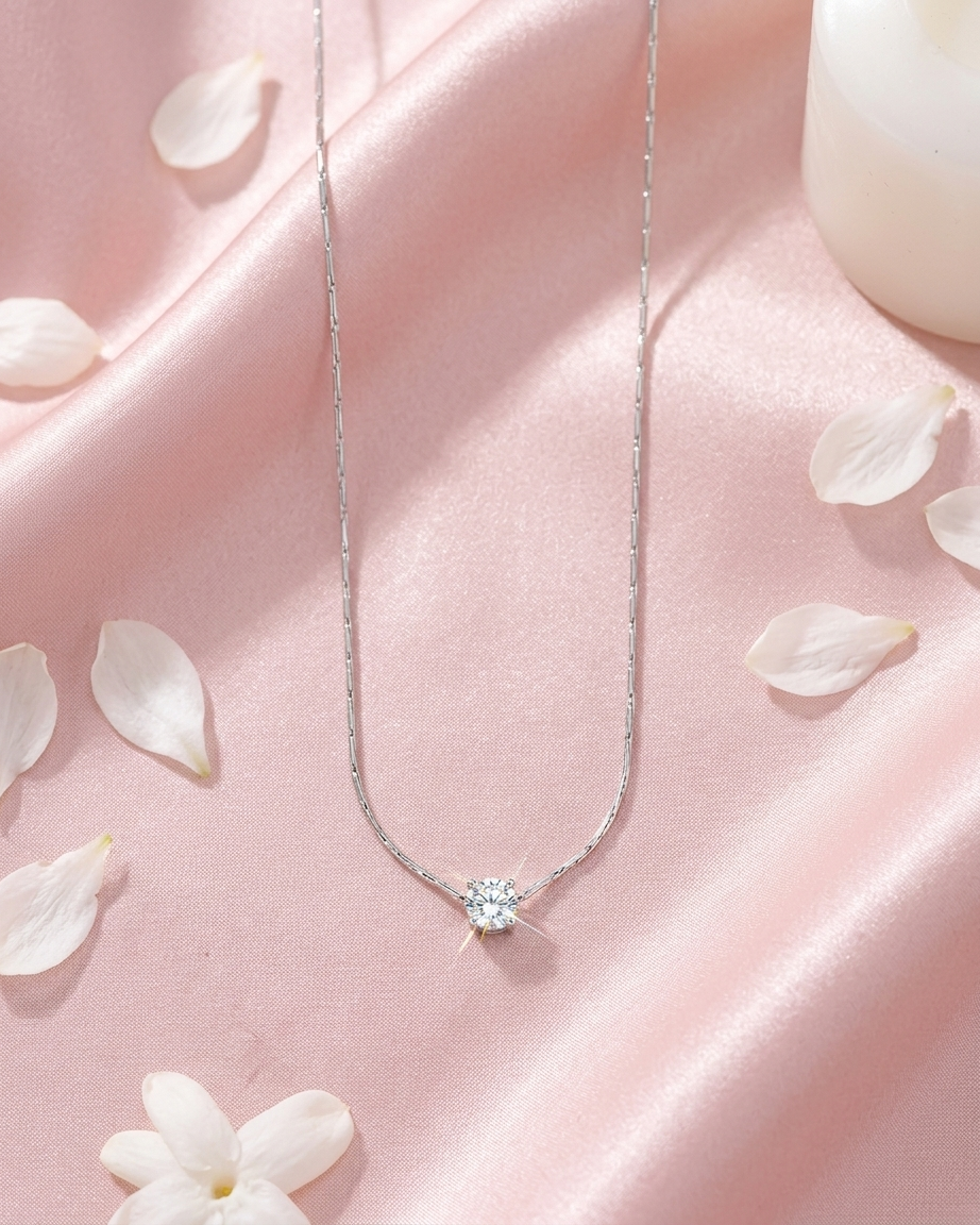 Our Silver Solitaire Crystal Necklace is designed for those who prefer the cool, crisp elegance of silver tones over traditional gold. Moving away from standard link chains, this piece features a specialized “etched” chain that provides a seamless, shimmering silhouette against the skin. The central brilliant-cut crystal is secured in a classic four-prong setting to maximize light reflection, ensuring a dazzling sparkle from every angle. Crafted for durability and style, it is an essential staple for any modern, curated jewelry wardrobe.
