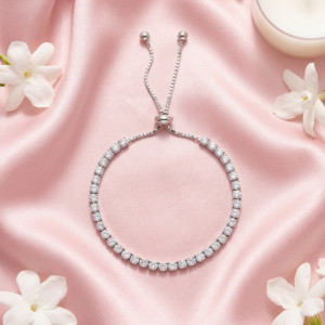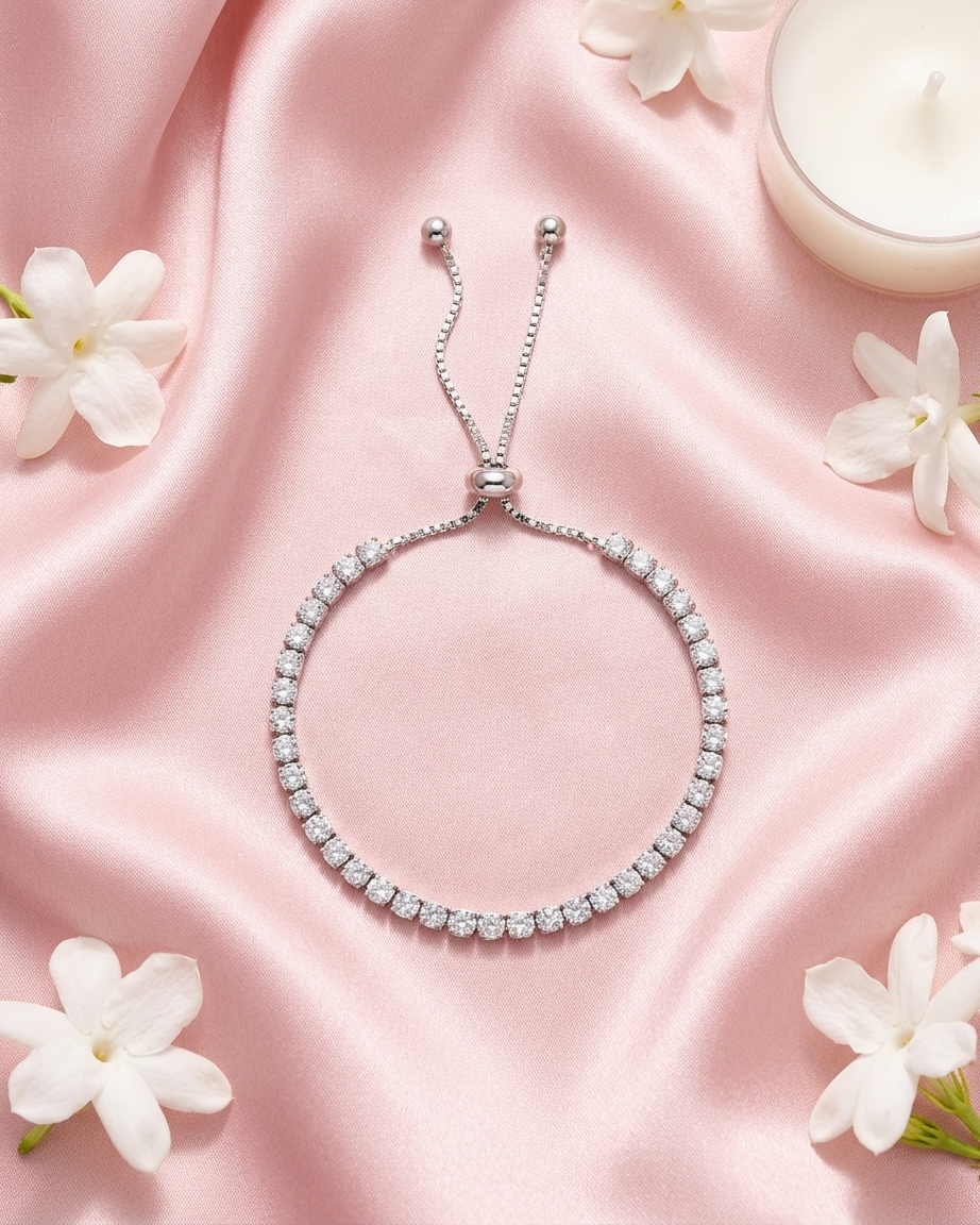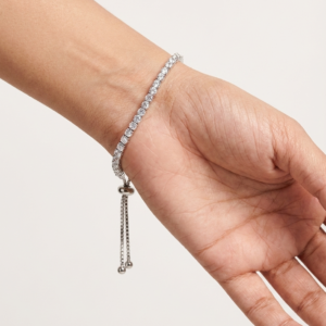 Our Adjustable Tennis Bracelet is the ultimate “quiet luxury” staple. Each crystal is individually held in a secure four-prong mount to maximize light entry, resulting in a continuous shimmer that moves with you. Unlike traditional clasp bracelets, this piece features a modern bolo-style slider mechanism with delicate silver beads, allowing you to tighten or loosen it with one hand for a custom fit. Whether you’re layering it with a watch for a professional look or wearing it alone as a sophisticated accent, its “life-proof” design ensures it maintains its brilliant luster through all your daily activities.