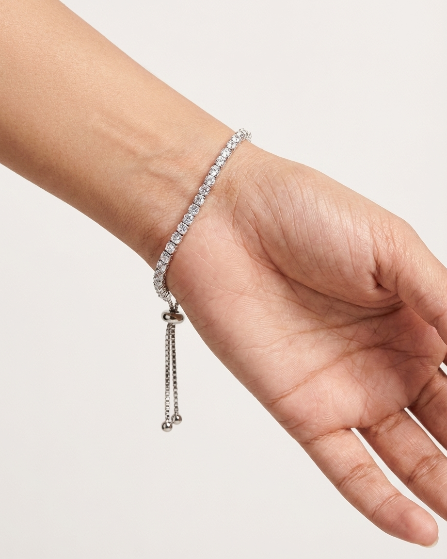 A classic re-imagined. This high-quality silver-finish tennis bracelet features a radiant line of AAA+ crystals and a convenient adjustable bolo slider, ensuring a perfect, secure fit for every wrist.